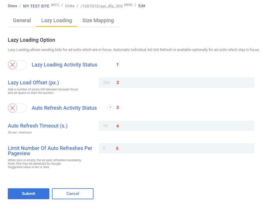 HeadBidder User Manual : Edit Ad Unit. Lazy Loading Option Tab.