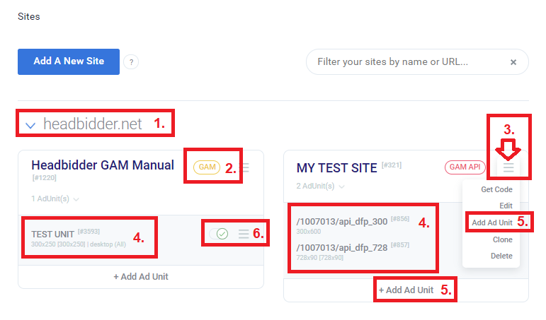 2. Site name. Under it, a publisher creates ad units or edit site parameters.