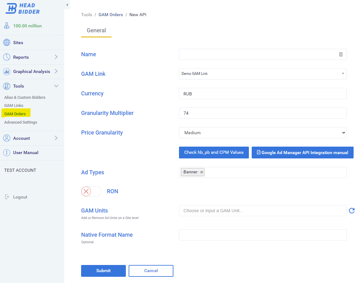 There are two types of GAM Order API-based integrations available. First - legacy one, when Publisher points several ad units from GAM Account exactly! Second - the new one, the RON option. Publisher attaches the whole GAM account and may use any ad unit further.