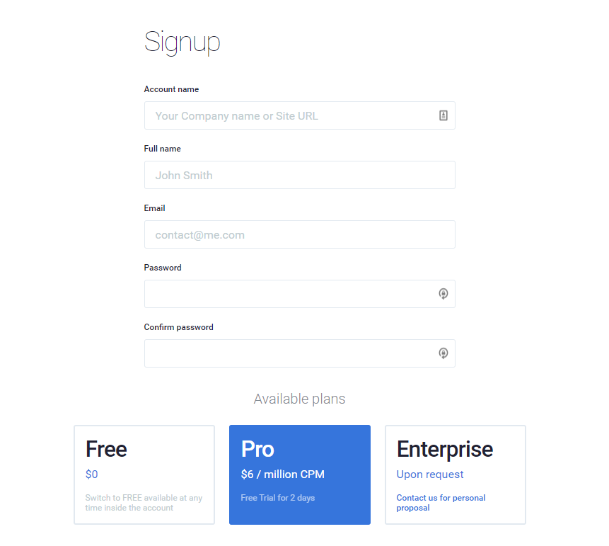 The PRO option is pre-selected at this stage and users are offered to test pro functions for two days free of charge. Switch to/from the FREE account is always available in the UI, the ENTERPRISE option might be requested in UI also or by contacting us here: https://headbidder.net/contact