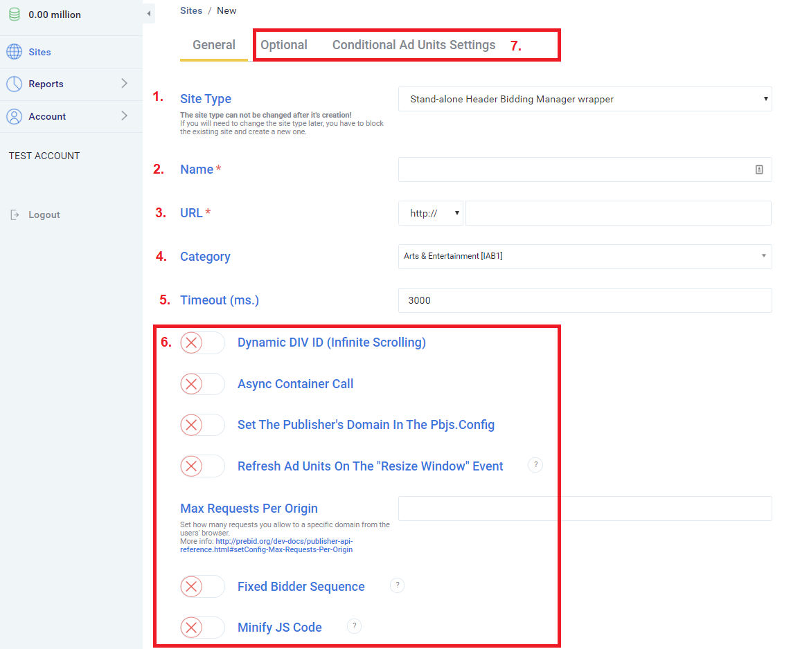 7. There are four more tabs in the site parameters: “Optional”, “Bid Adjustments”, “Conditional Ad Units Settings” (applicable for Google Ad Manager integrations only) and “User Sync”.