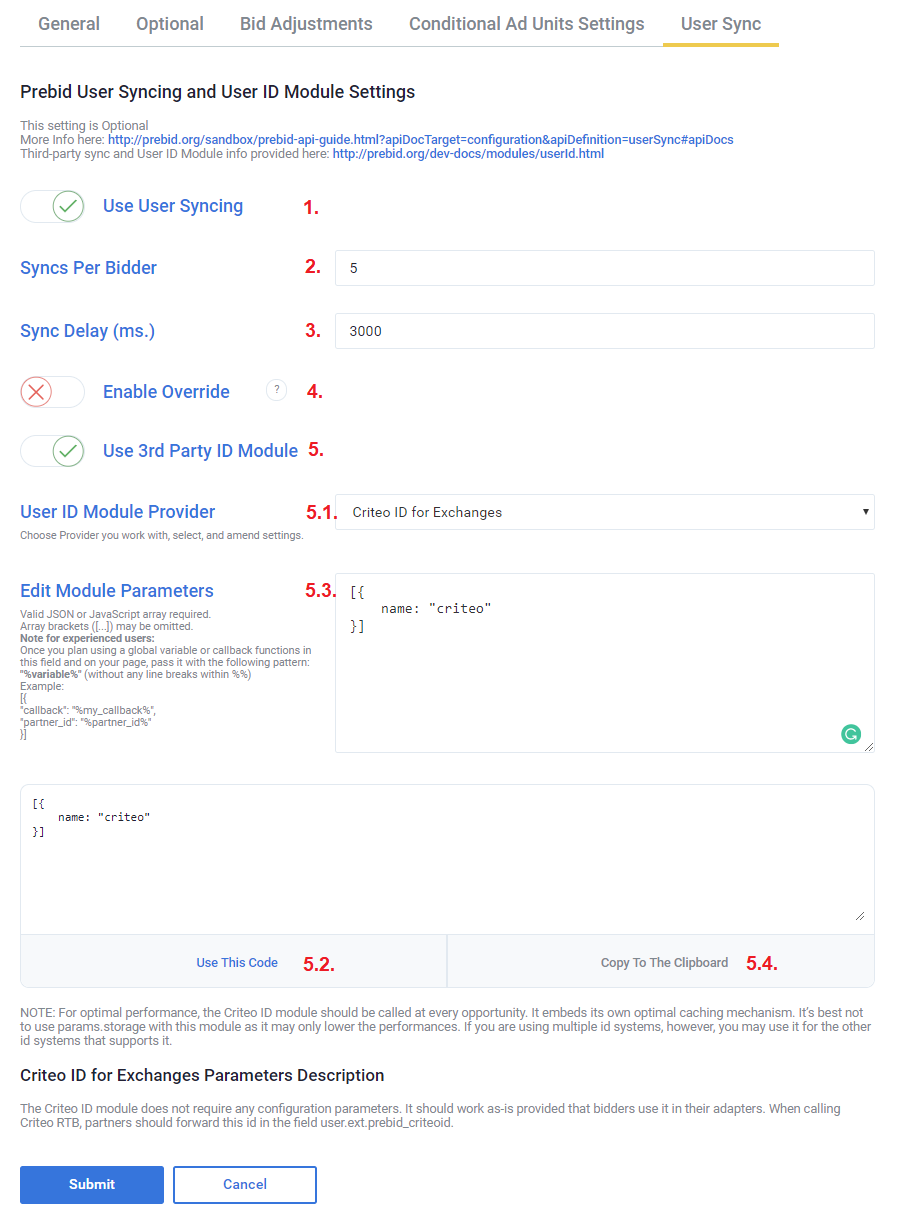 HeadBidder User Manual : Supplementary Site Parameters. User Sync Tab