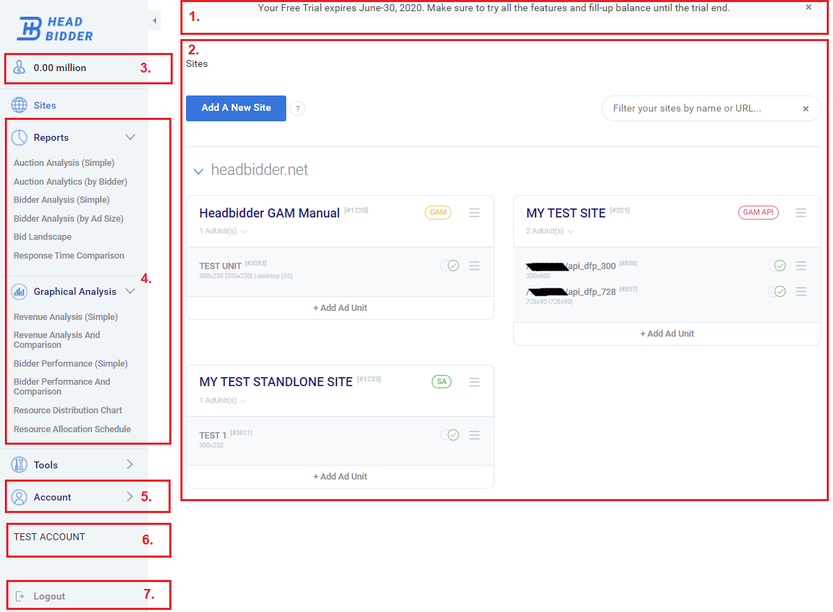 List of sites and their ad zones, “add new site” button, management elements for sites and ad zones;